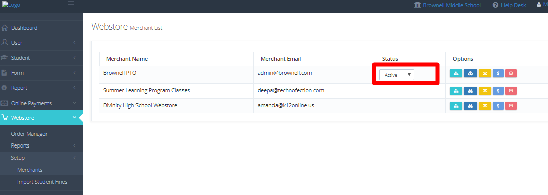 In the Merchant List, you will see that DCP Webstores do not show all the options that you would normally see. This is what makes the Merchant district-controlled. Admins at the school level will not be able to make any edits to the merchant. They will only be able to change the status of the sale-able merchandise.